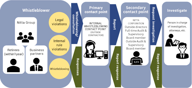 The Nitta Group has introduced an internal reporting system that enables all employees, including officers, Audit & Supervisory Board members, employees, contract employees, fixed-period employees, part-time workers, nonregular employees, dispatched employees, and retirees (within one year of retirement), as well as employees of business partners, to make reports to dedicated contact points for the prevention, early detection, and remediation of organizational or personal misconduct within the Nitta Group.