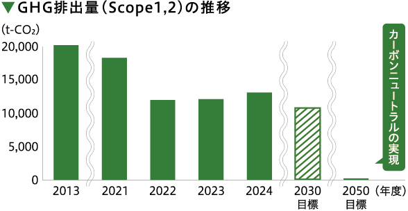 - 国内外グループ生産拠点(工場)から排出する温室効果ガスの削減(Scope1、2)