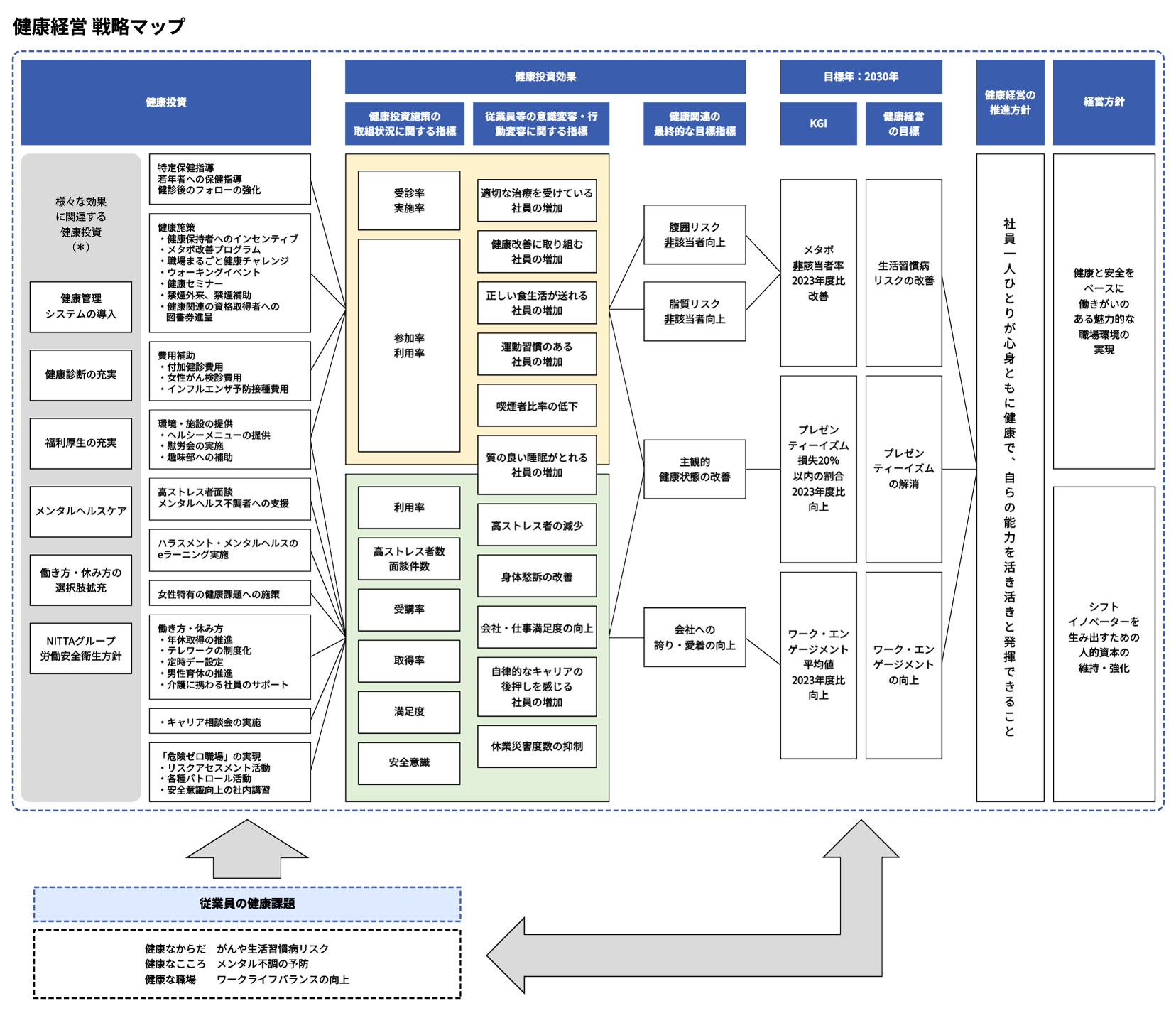 成果指標の達成のために、個別施策と成果指標の繋がりを「健康経営戦略マップ」として明確化し、図示しています。以下のリンク先をご参照ください。
