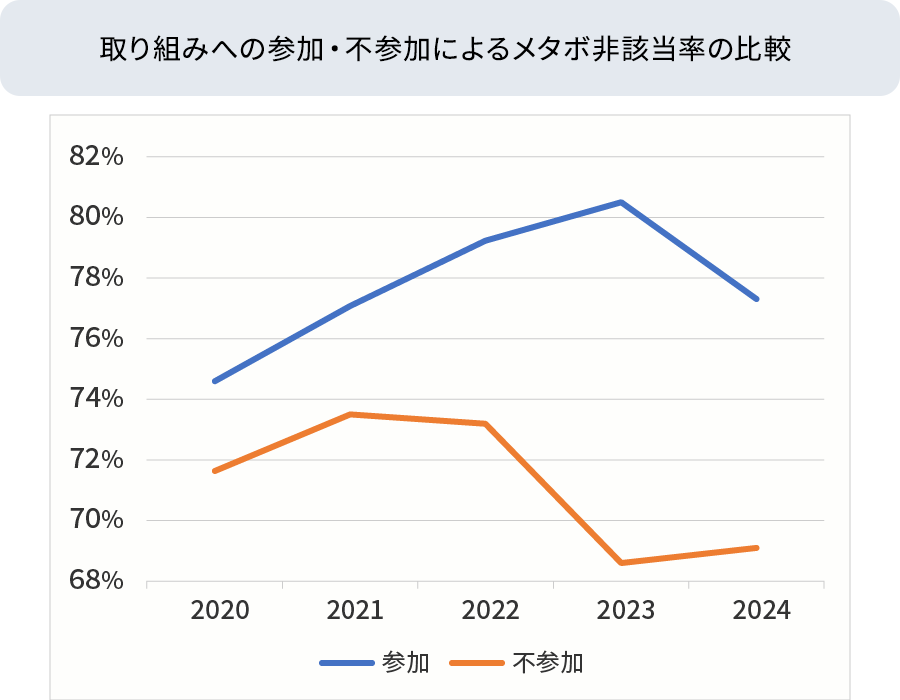 その結果、2021年度時点で脂質リスク該当者率では目標を上回る3.2%の低減を達成しました。メタボ該当者率は2.0%低減したものの、目標未達となりました。